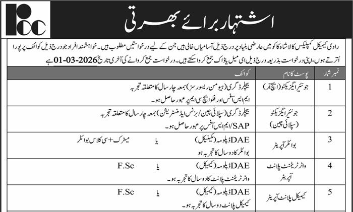 Ravi Chemical Complex has announced multiple job vacancies as per the advertisement published on 16 February 2026 in the Roznama 92 News Newspaper. These positions are available at G.T Road, Lahore, Punjab, Pakistan, offering career opportunities in technical, management, and support staff categories. The organization is seeking qualified and motivated candidates for various posts including … Read more