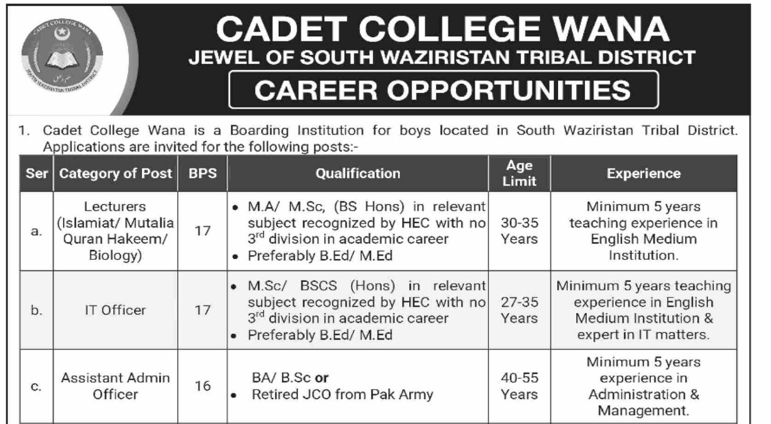 Cadet College Wana Latest Jobs April 2026 Advertisement