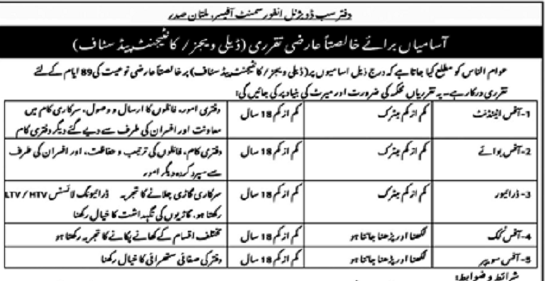 Punjab Enforcement & Regulatory Authority (PERA) has announced new government job opportunities through an advertisement for temporary staff positions in the office of the Sub-Divisional Enforcement Officer, Multan Saddar. These vacancies were announced in 2026 to fulfill departmental requirements on a short-term basis. The available positions include Office Attendant, Office Boy, Driver, Office Cook, and … Read more