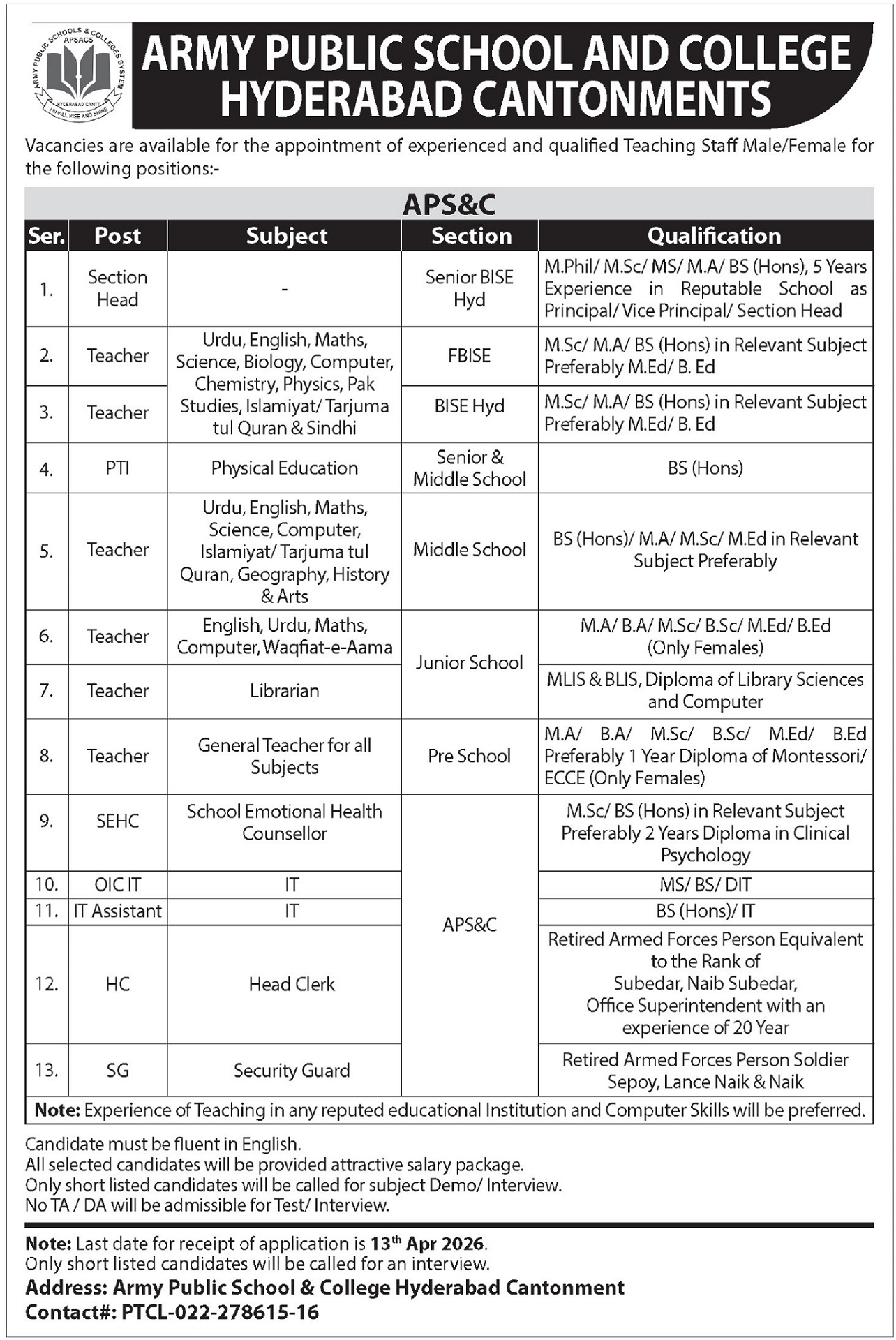 Army Public School & College (APS&C) has announced new government job opportunities through an advertisement published on 6 April 2026 in the Daily Express Tribune Newspaper. These vacancies provide excellent career opportunities for candidates seeking teaching and administrative roles in the education sector.