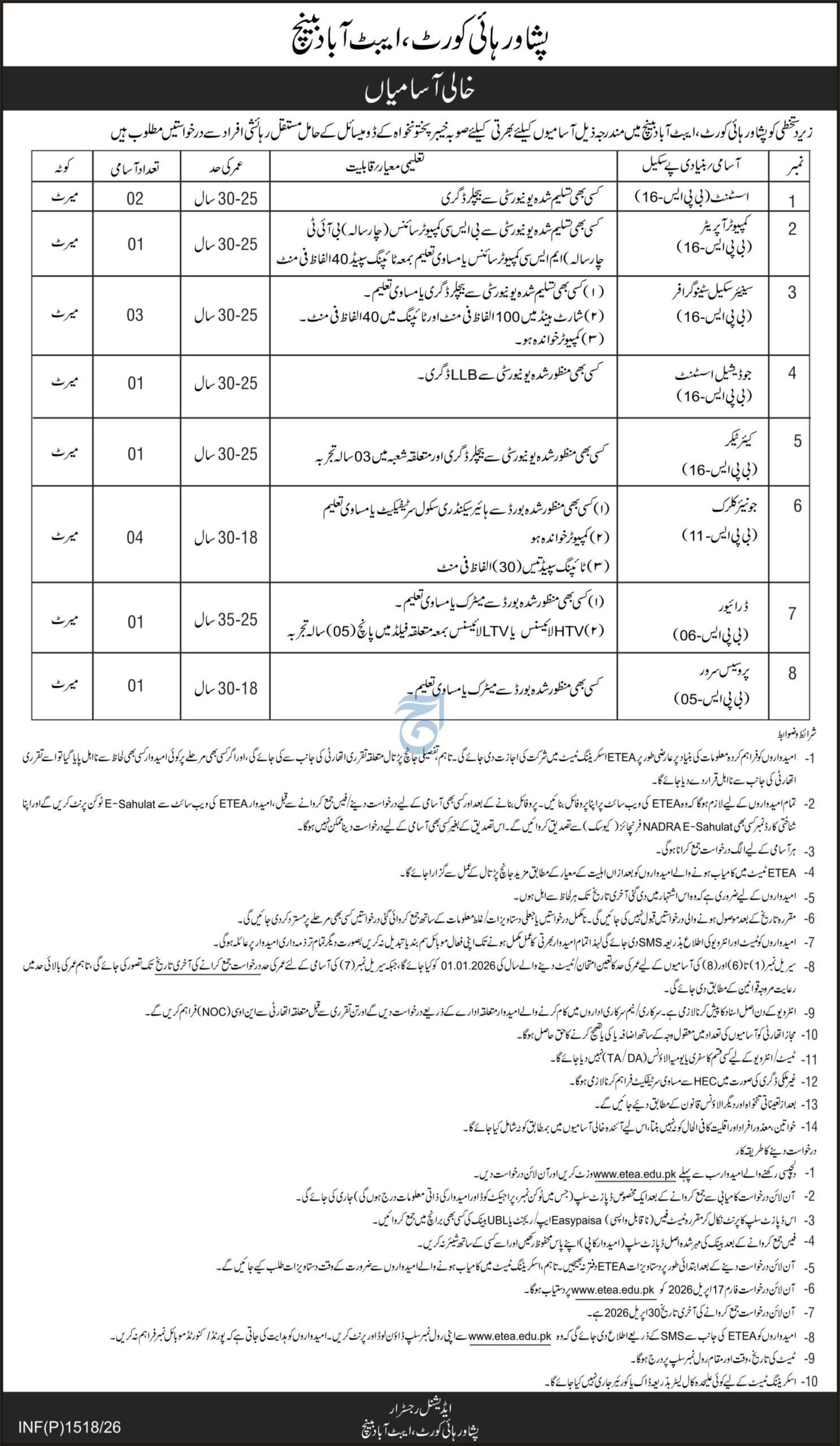 The High Court has announced multiple job vacancies as per an advertisement published in the Daily Aaj Newspaper on April 13, 2026. These opportunities are available in Pakistan, offering a great chance for candidates seeking government jobs in the judicial and administrative sector.