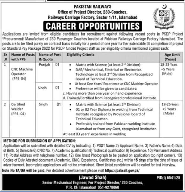 According to the official advertisement, Pakistan Railways is inviting applications from eligible and experienced individuals for specialized technical positions. Candidates who meet the required qualifications and relevant experience criteria are encouraged to apply within the prescribed deadline.