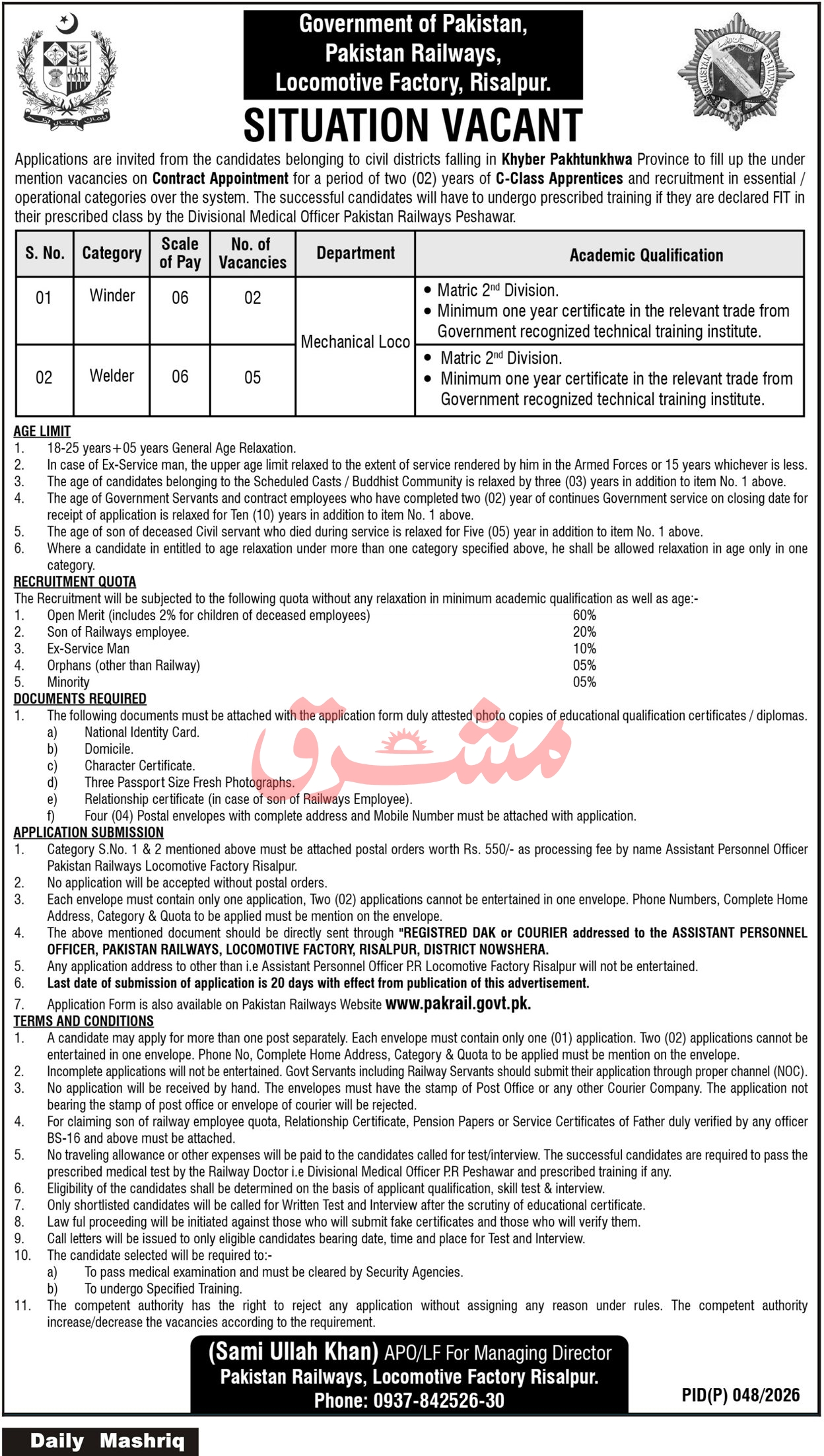 Pakistan Railways Jobs 2026 have been announced through the Daily Mashriq Newspaper on 28 March 2026. Applications are invited from eligible and skilled candidates for technical positions in the railway sector. These government job opportunities are ideal for individuals seeking stable employment in a well-established organization.