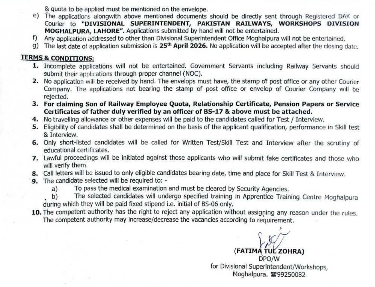 The last date to apply for Pakistan Railways Jobs 2026 is 25 April 2026, or as per the closing date mentioned in the official advertisement. Applicants are advised to submit their applications before the deadline to ensure consideration.