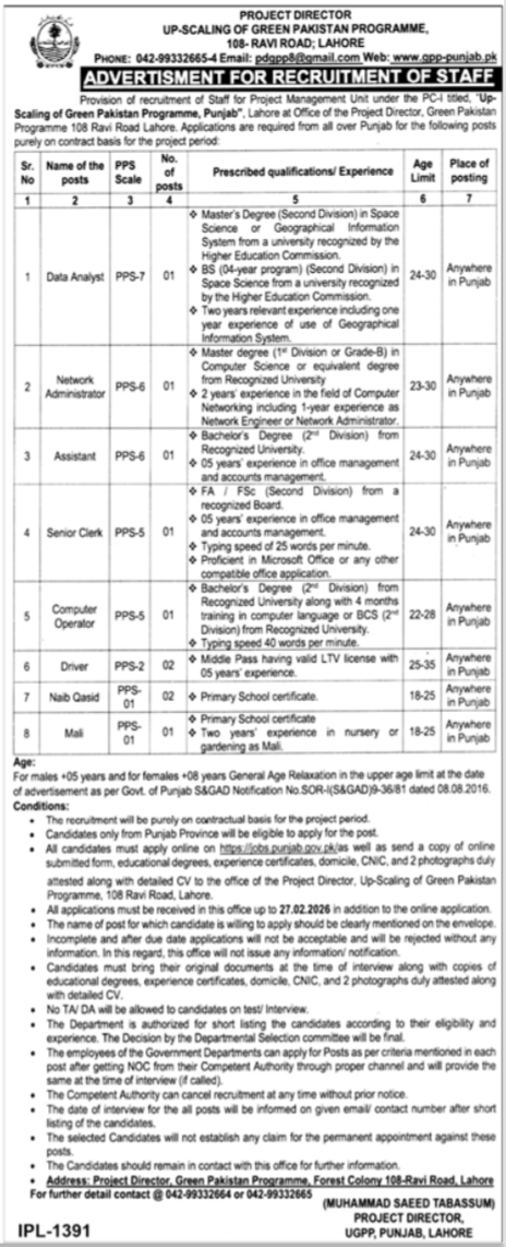 Available positions include Assistant, Naib Qasid, Data Analyst, Network Administrator, Computer Operator, Driver, Senior Clerk, and Mali.