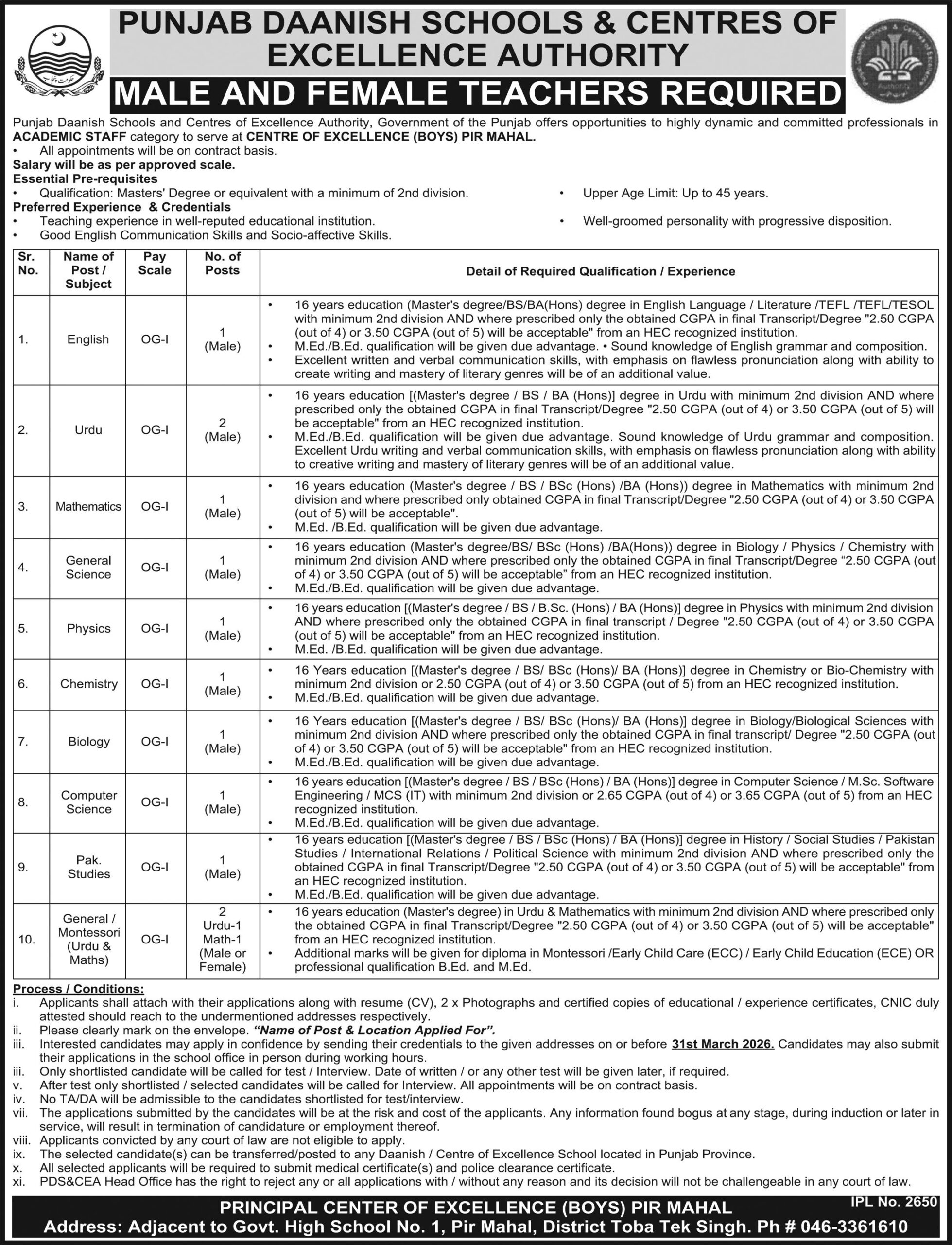 The available vacancies are located at Pir Mahal, Toba Tek Singh, Punjab, Pakistan. Punjab Daanish Schools & Center Of Excellence Authority is well known for providing quality education and maintaining high academic standards. The institution aims to recruit competent and motivated teachers who can contribute effectively to academic excellence and student development.