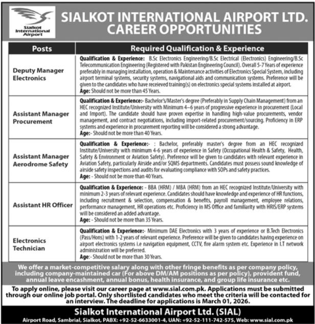 Sialkot International Airport Ltd operates as a corporate entity; applicants should refer to the advertisement for employment details.