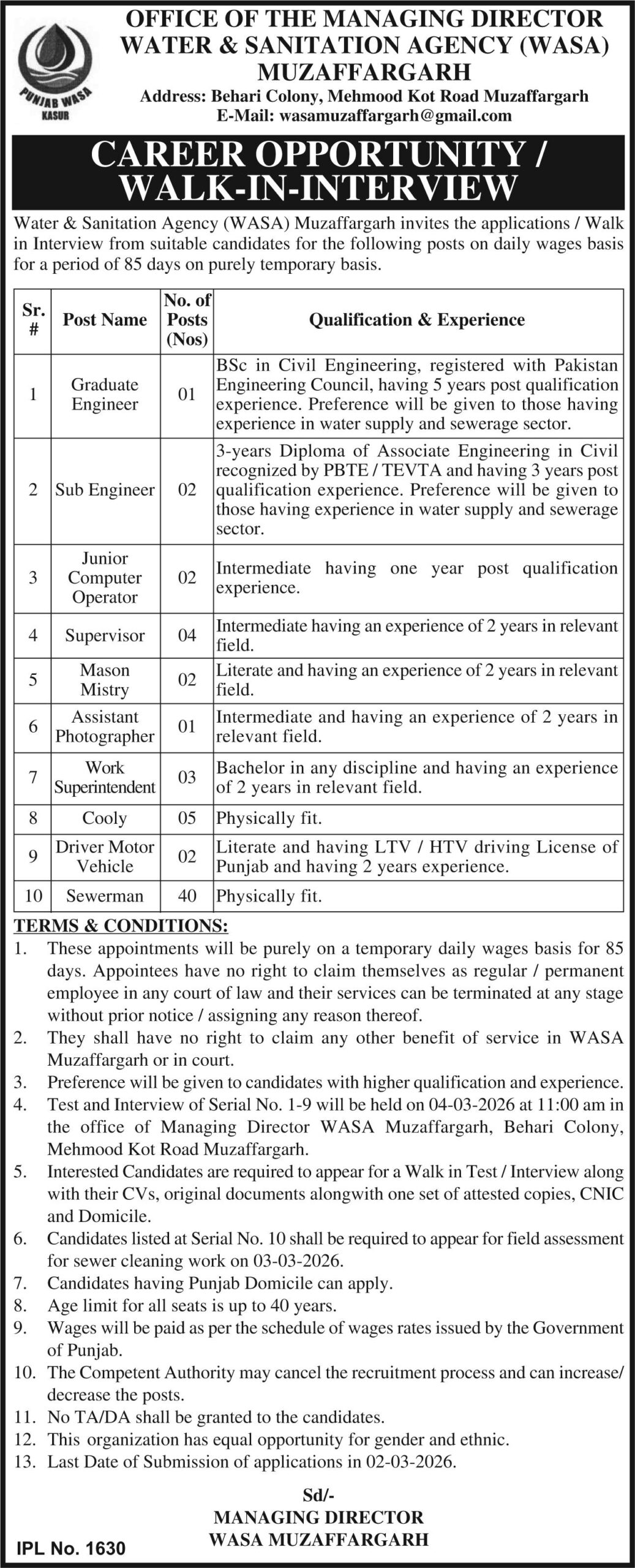 Water and Sanitation Agency WASA Muzaffargarh has announced multiple new government job opportunities as per the advertisement published in the Daily Other Newspaper on February 13, 2026. These latest vacancies are available in Muzaffargarh, Punjab, Pakistan, providing excellent career prospects for candidates seeking Management and technical government jobs in 2026.